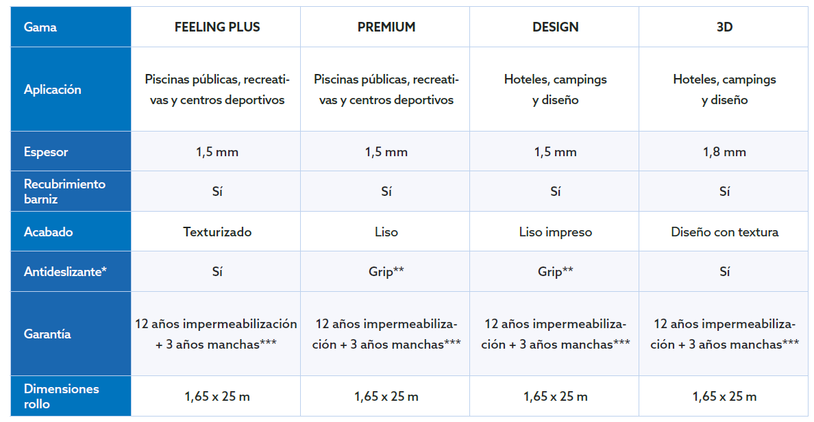 FEELING PLUS & PREMIUM: Láminas texturizadas o lisas de 1,5 mm, perfectas para piscinas públicas y deportivas.