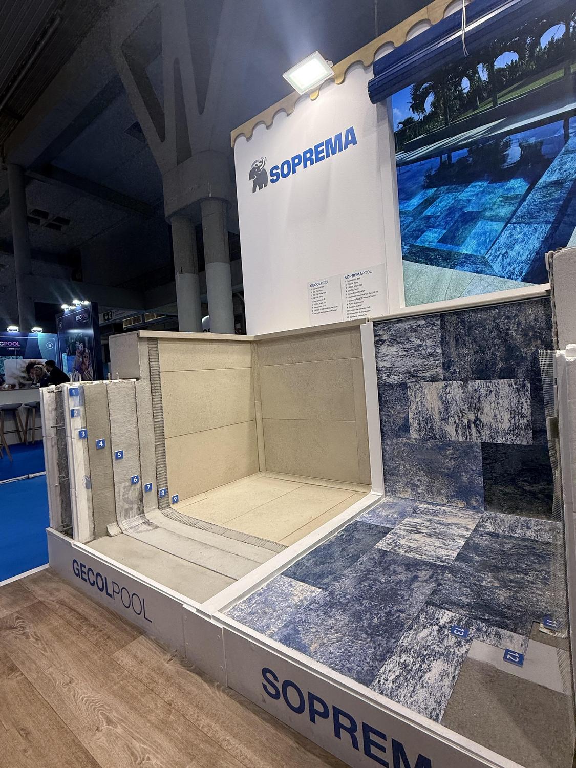 El stand también incluyó una maquetatécnicacompleta que mostraba todas las capas del sistema SopremaPool y Gecolpool. Esta maqueta se convirtió en uno de los elementos más visitados del stand, despertando gran interés entre instaladores, arquitectos y profesionales del diseño que buscaban conocer en detalle la solución técnica completa.