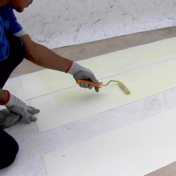 Aplicar uniformemente el adhesivo con brocha o rodillo sobre ambos sustratos a pegar, aproximadamente 200 gramos por metro cuadrado por cara.