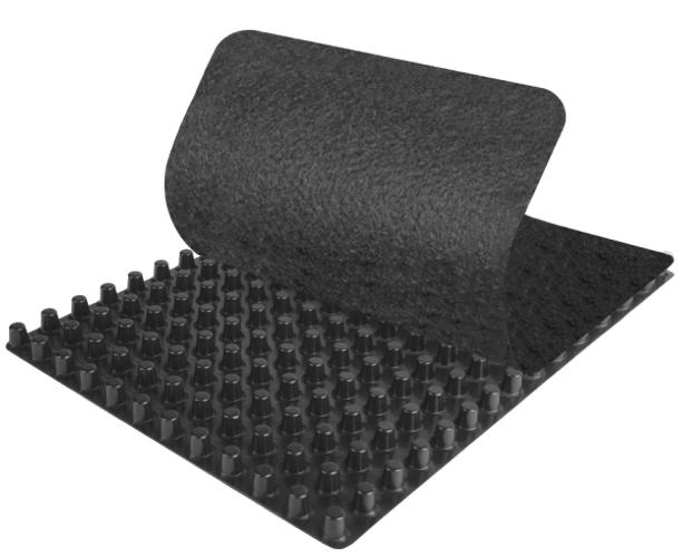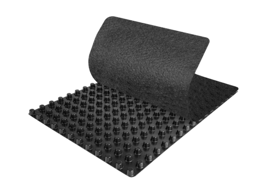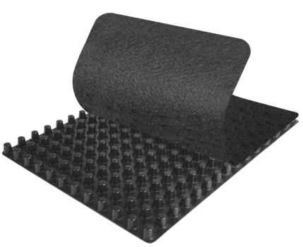 · El no-tejido de propileno actúa como filtro del agua, para impedir que la tierra acabe taponando el drenaje, mientras que los nódulos de poliestireno conducen y evacuan el agua. El sistema completo funciona como drenaje del agua, y protección de la impermeabilización del muro, la cimentación, etc.