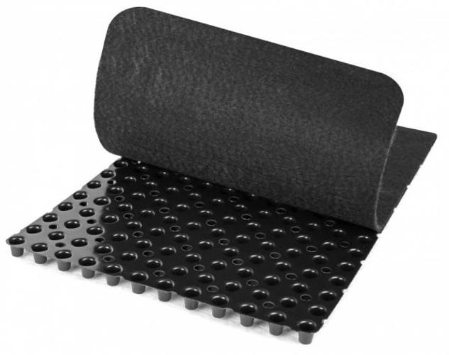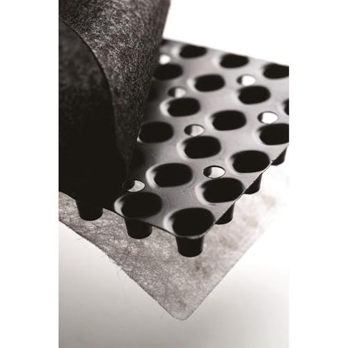 • El no-tejido de propileno actúa como filtro del agua, para impedir que la tierra acabe taponando el drenaje, mientras que los nódulos de poliestireno conducen y evacuan el agua. El sistema completo funciona como drenaje del agua, y protección de la impermeabilización del muro, la cimentación, etc.